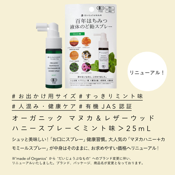 だいじょうぶなもの オーガニックマヌカ&レザーウッドハニースプレー ミント味 25ml