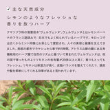 ミドリハッカ葉/茎水、グリセリン、1,2-ヘキサンジオール、テトラオレイン酸ソルベス-40、アルガニアスピノサ核油(アルガンオイル)、ボウシュウボク葉油(レモンバーベナ精油)、ベヘネス-20、PEG-60水添ヒマシ油、フェノキシエタノール、エチルヘキシルグリセリン