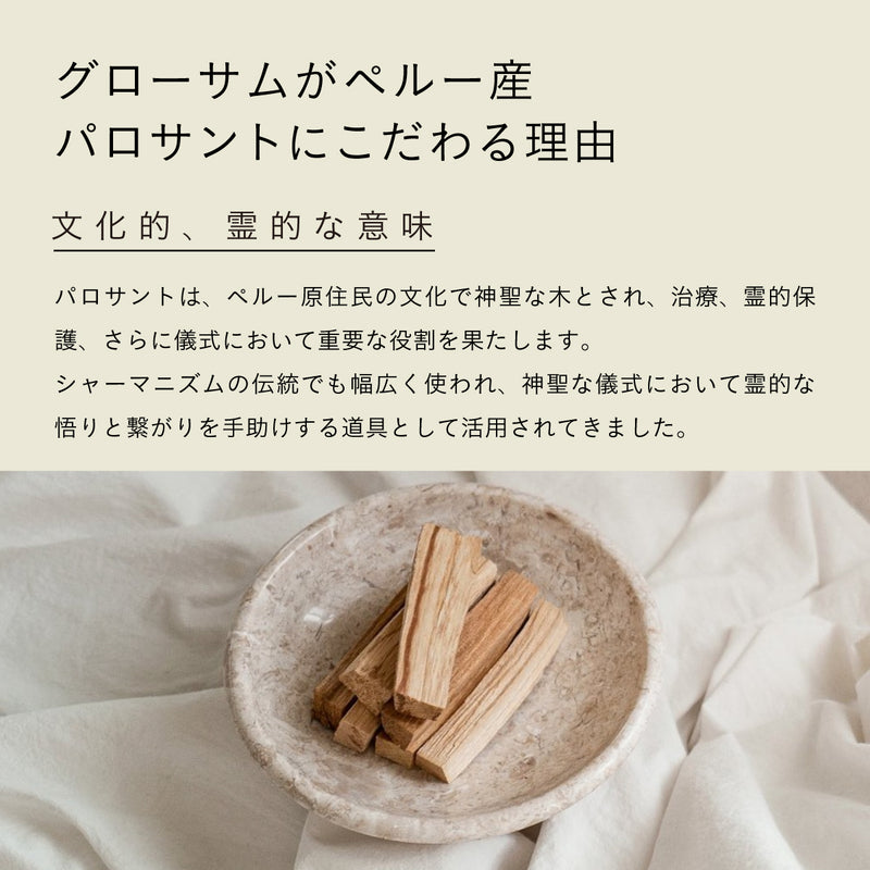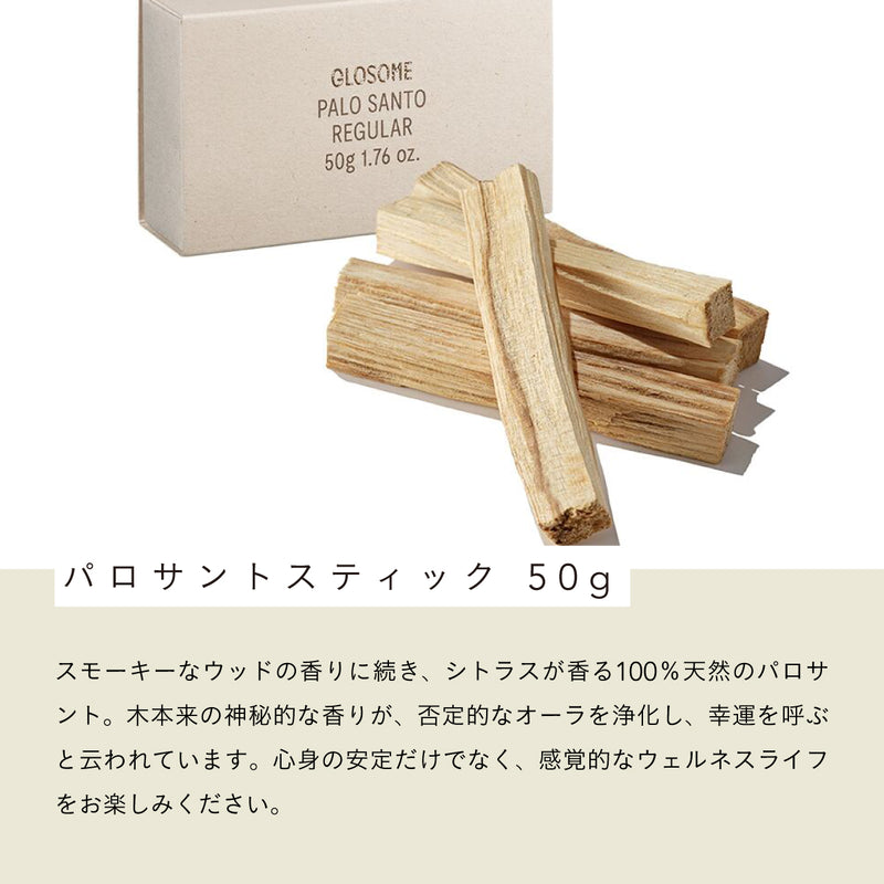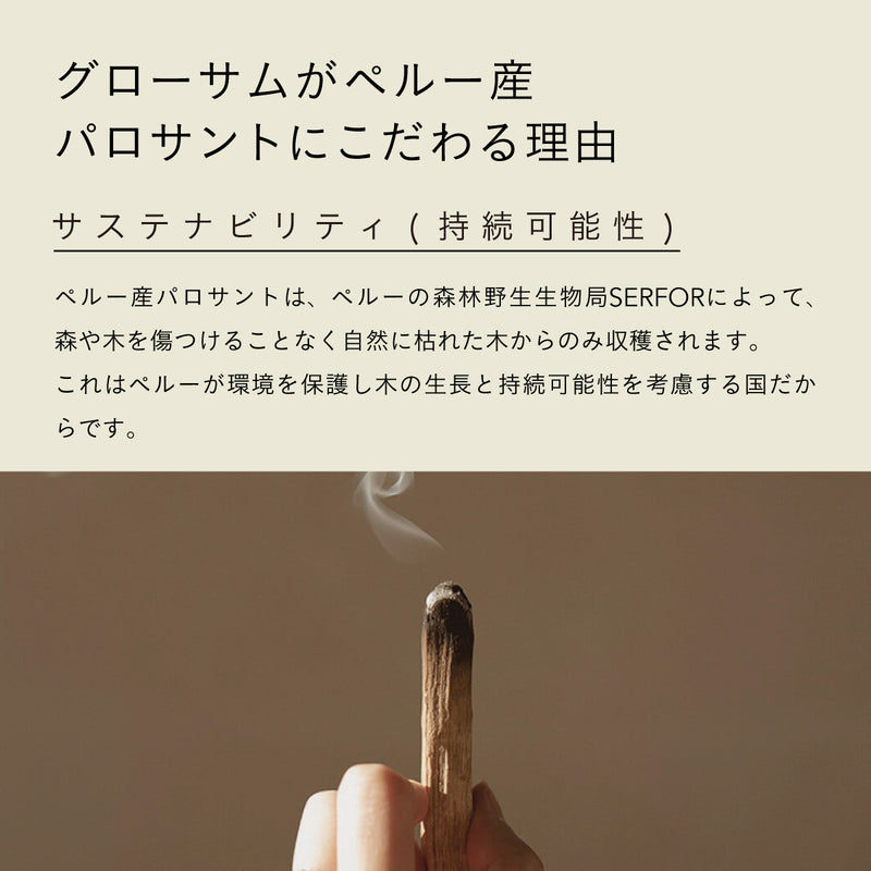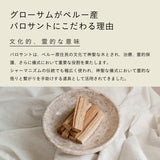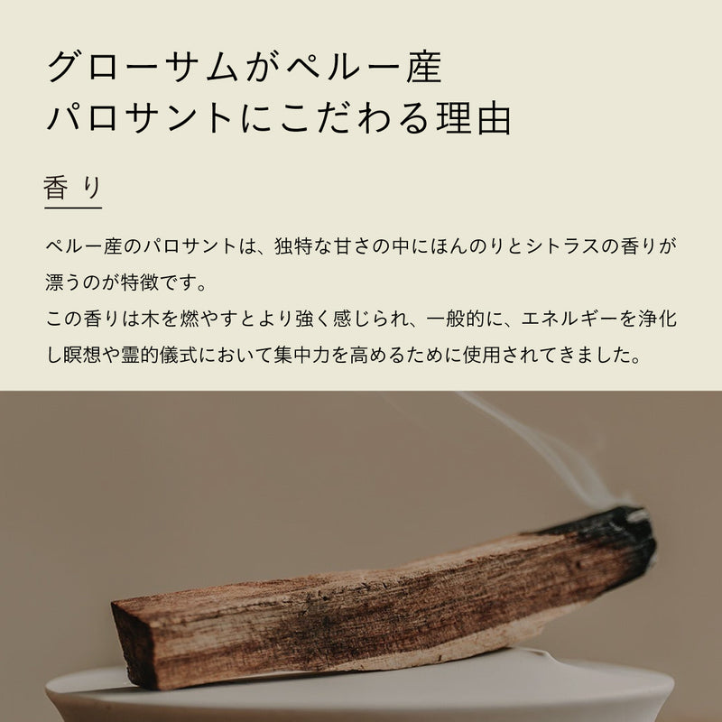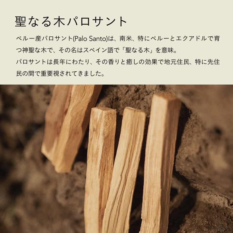 スモーキーなウッドの香りに続き、シトラスが香る100%天然のパロサント。木本来の神秘的な香りが、否定的なオーラを浄化し、幸運を呼ぶと云われています。心身の安定だけでなく、感覚的なウェルネスライフをお楽しみください。