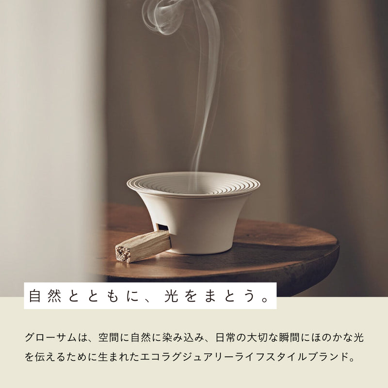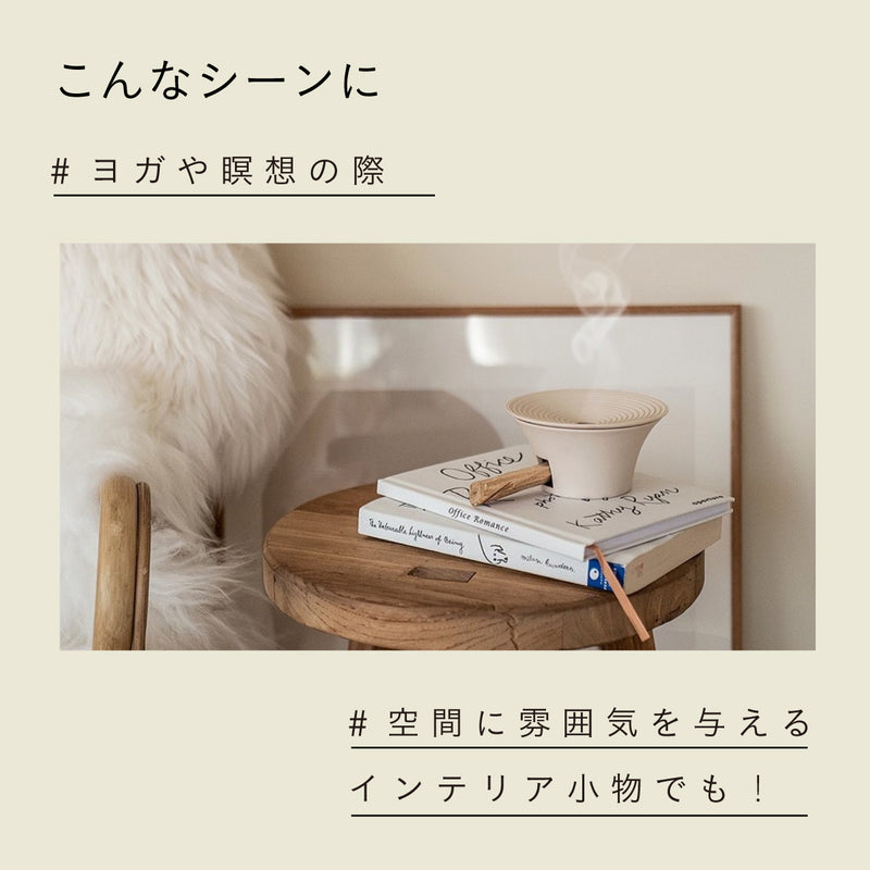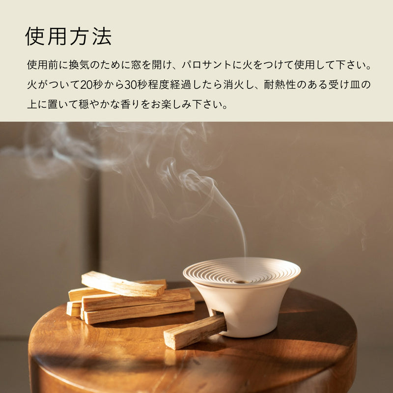 使用前に換気のために窓を開け、パロサントに火をつけて使用して下さい。火がついて20秒から30秒程度経過したら消火し、耐熱性のある受け皿の上に置いて穏やかな香りをお楽しみ下さい。